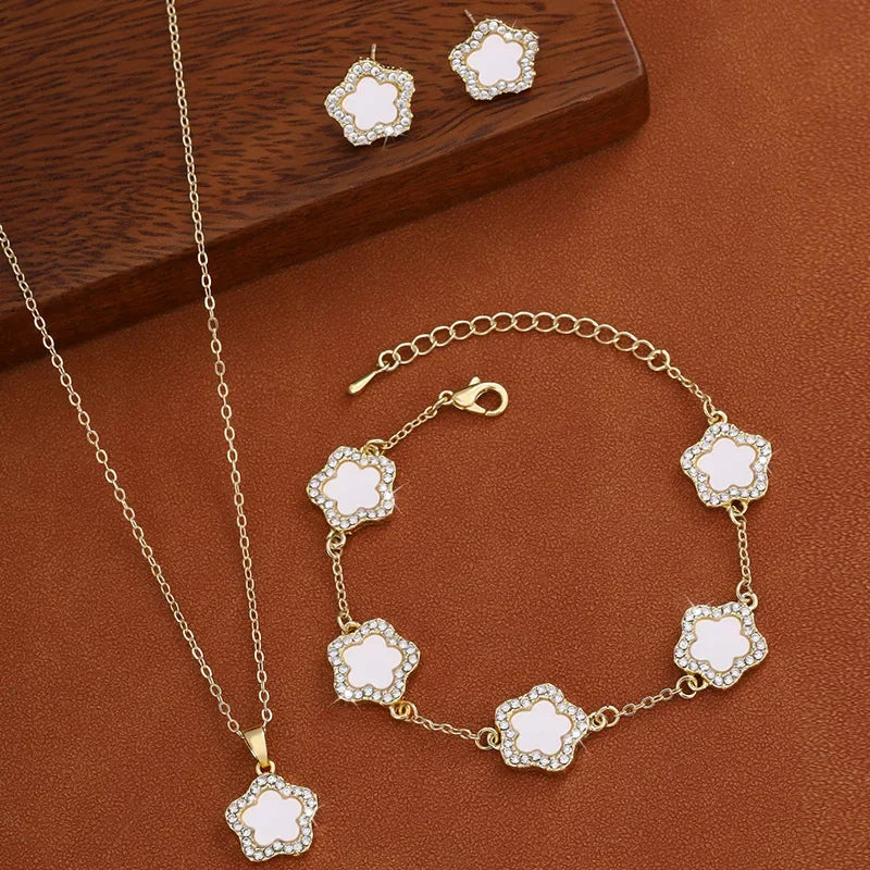 Conjunto de Joias de Luxo para Mulheres Corrente de Cor Prata em Aço Inoxidável Colar, Brincos e Pulseira Dupla Face com Flor de Cinco Folhas Trevo